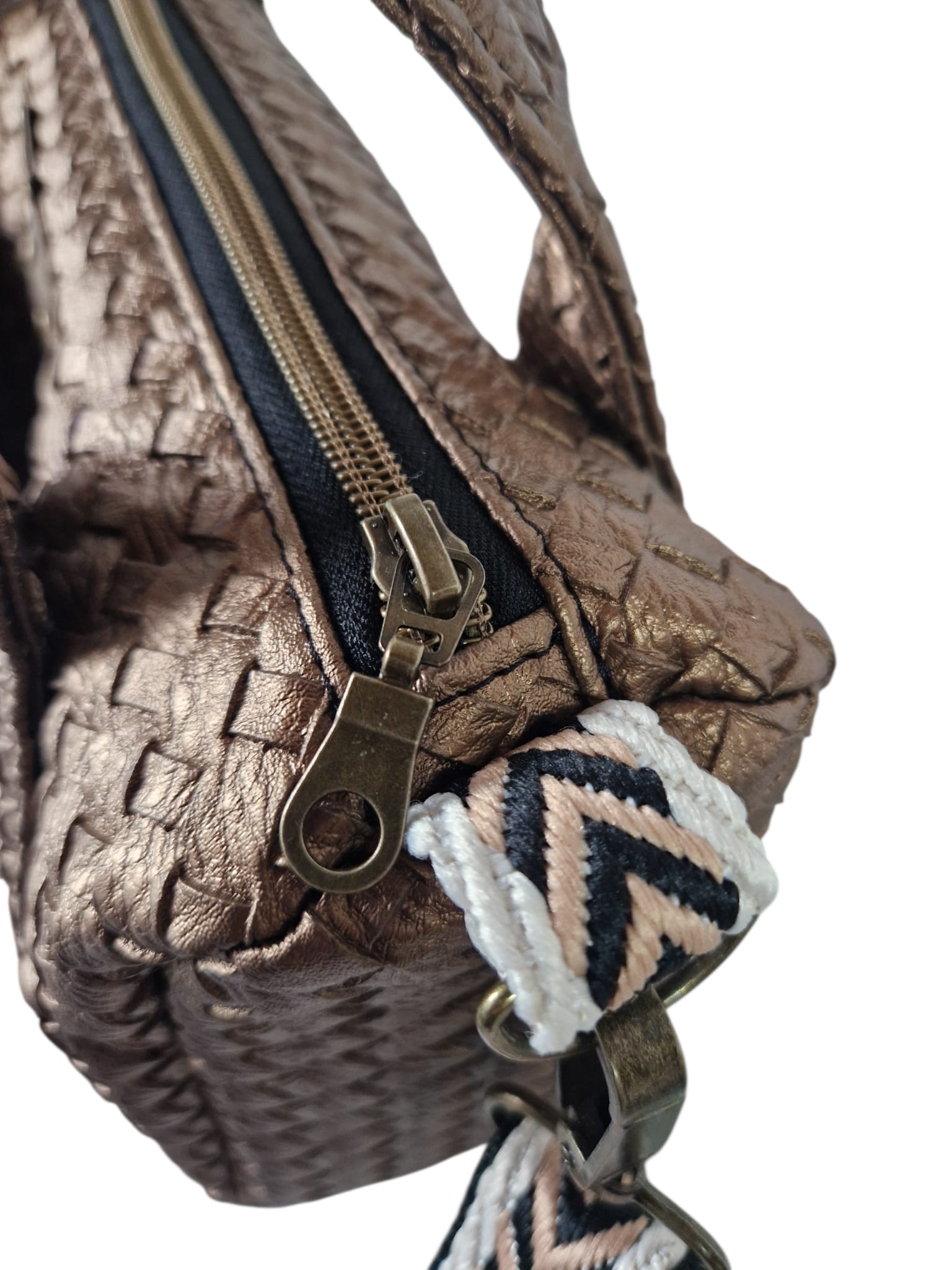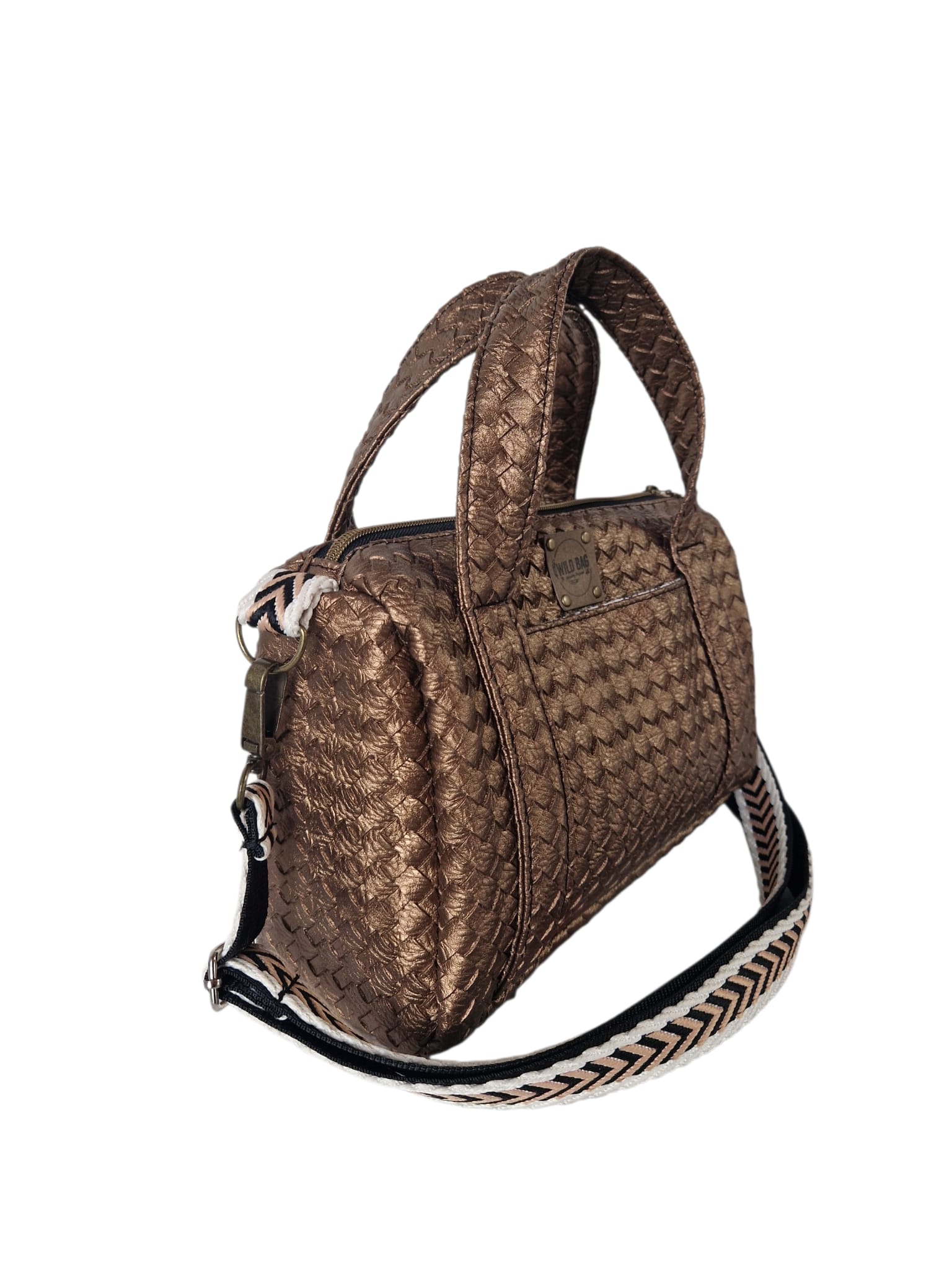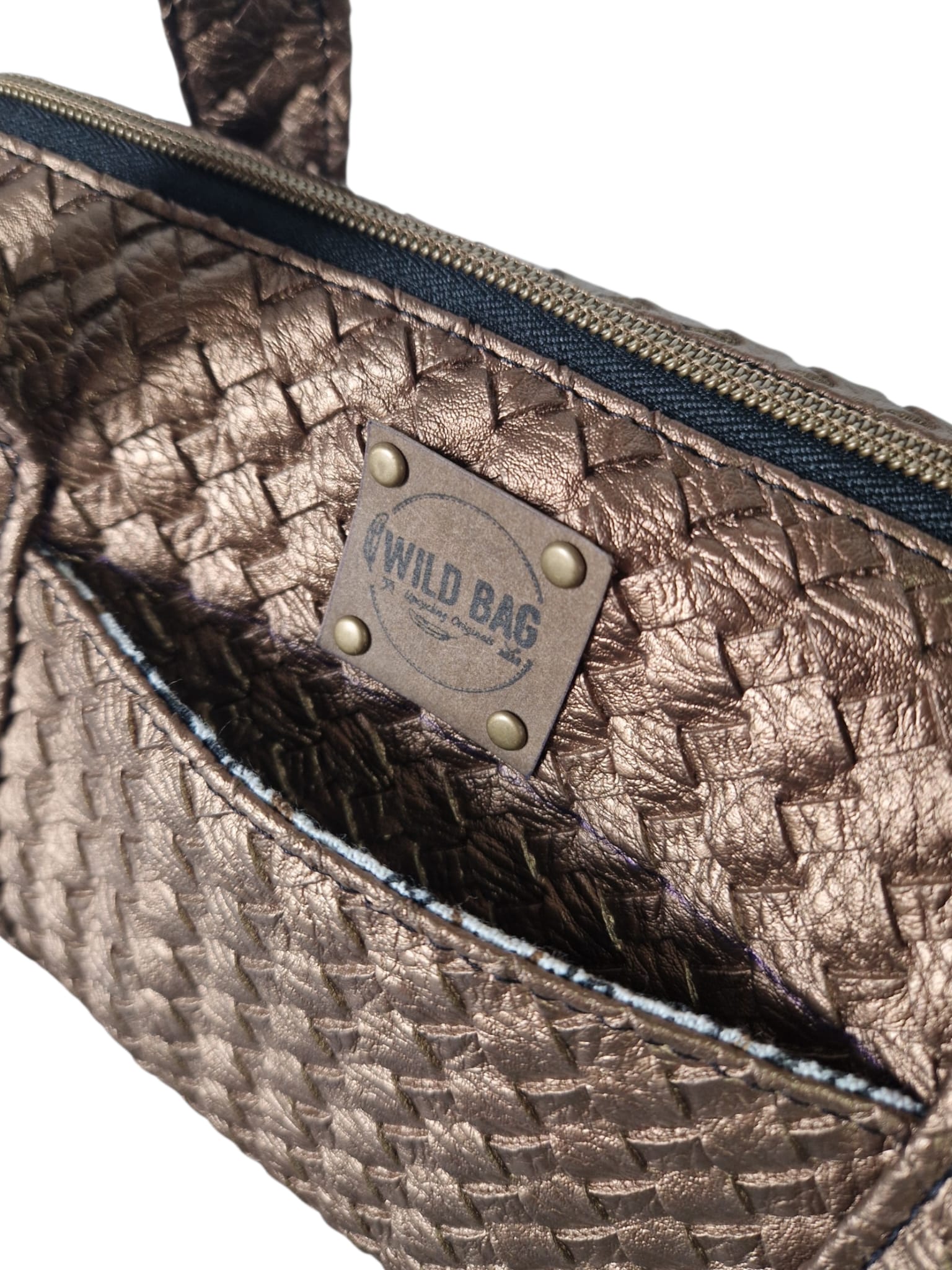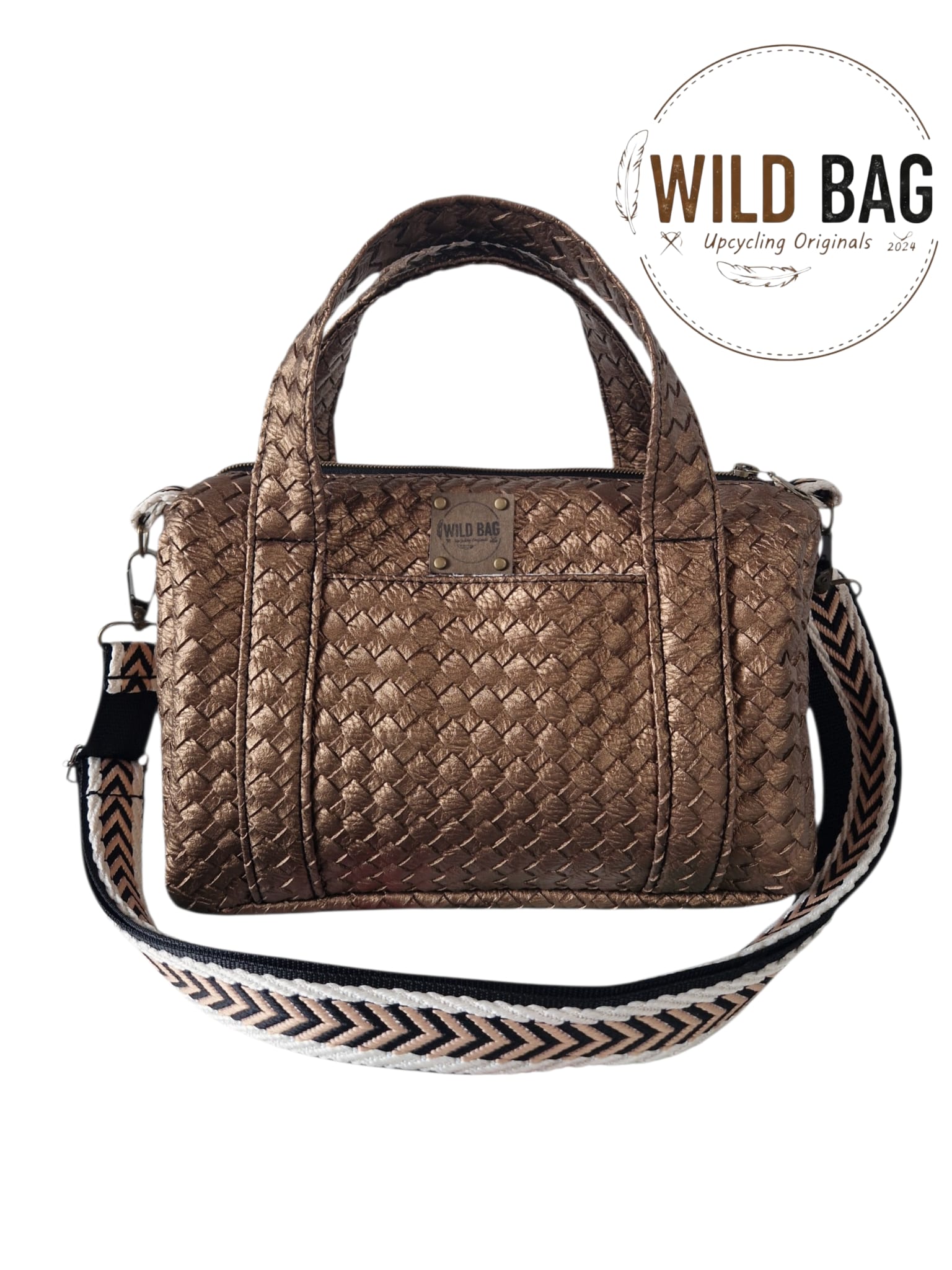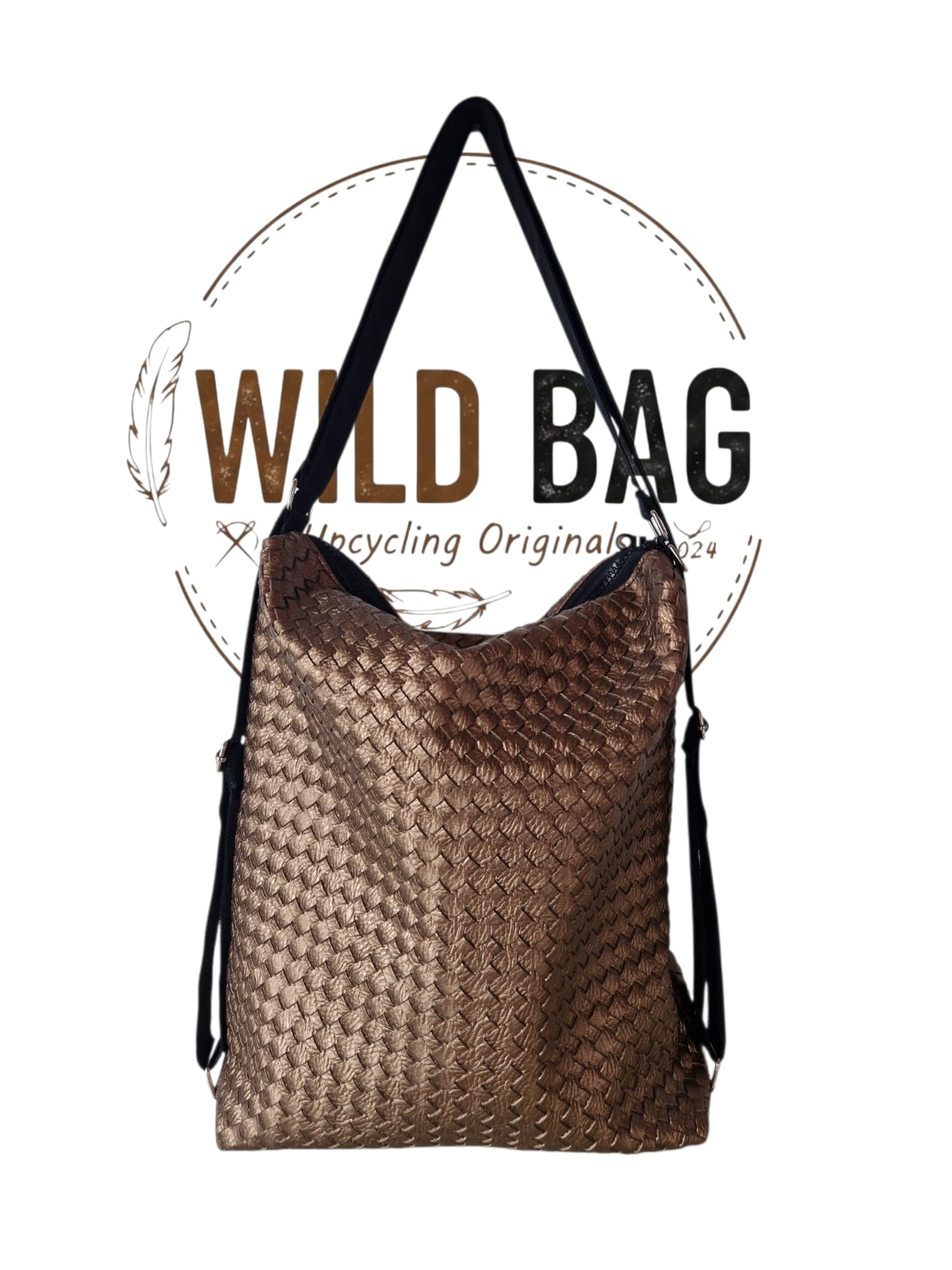 Material & Stil: Hochwertiges Upcycling-Material in edler Bronze-Metallic-Optik mit einer aufwendig geprägten Flechtstruktur.