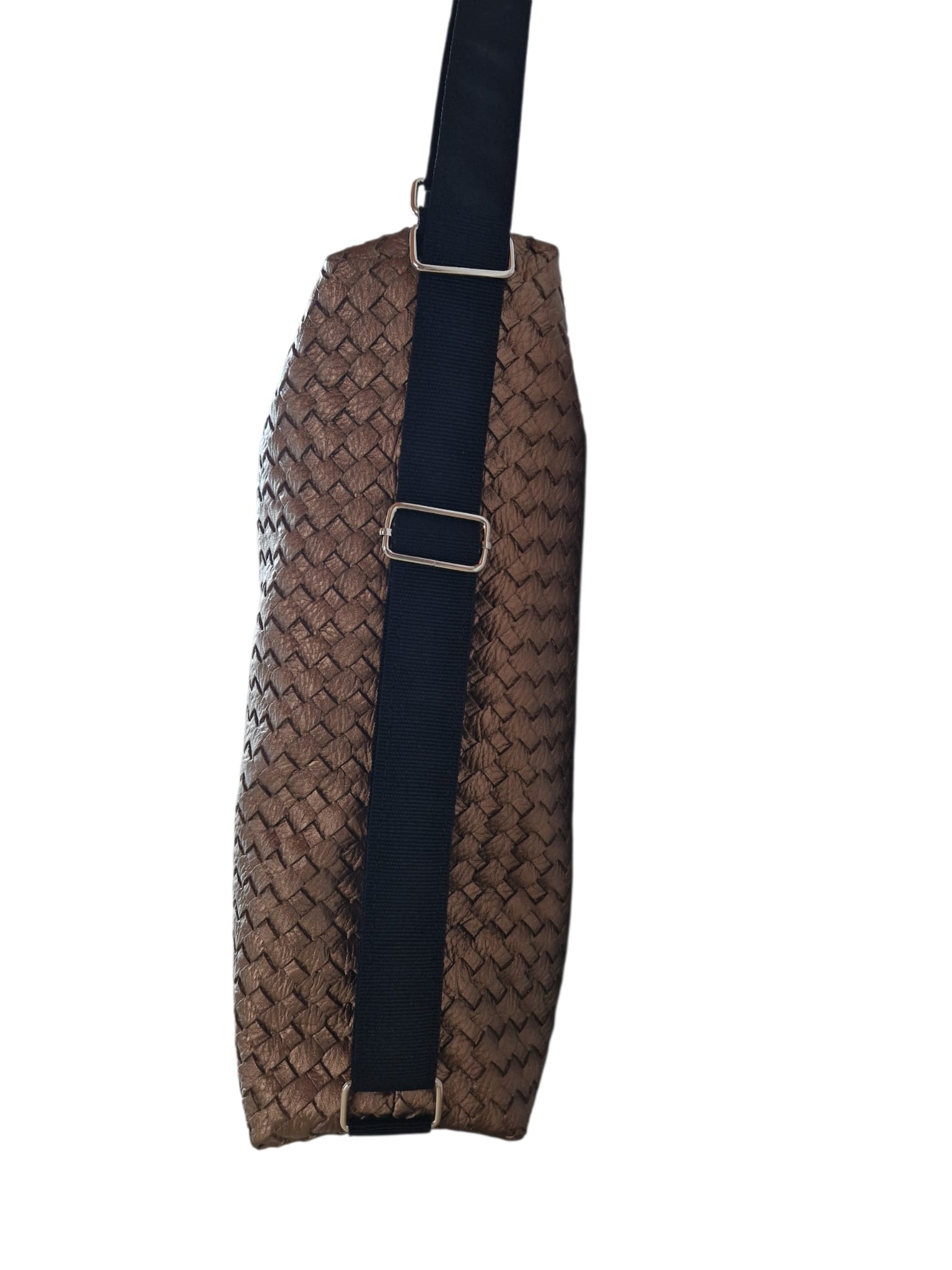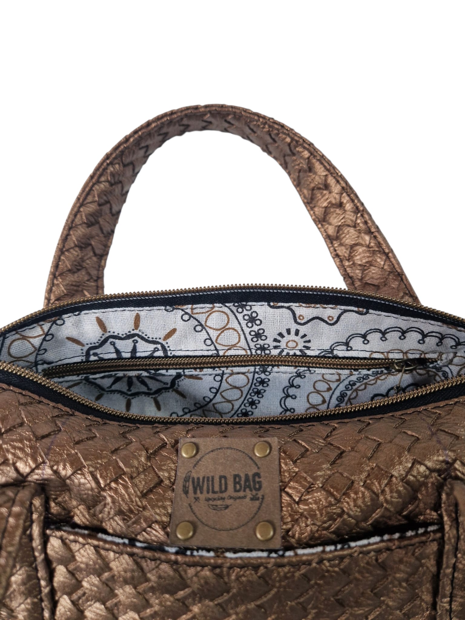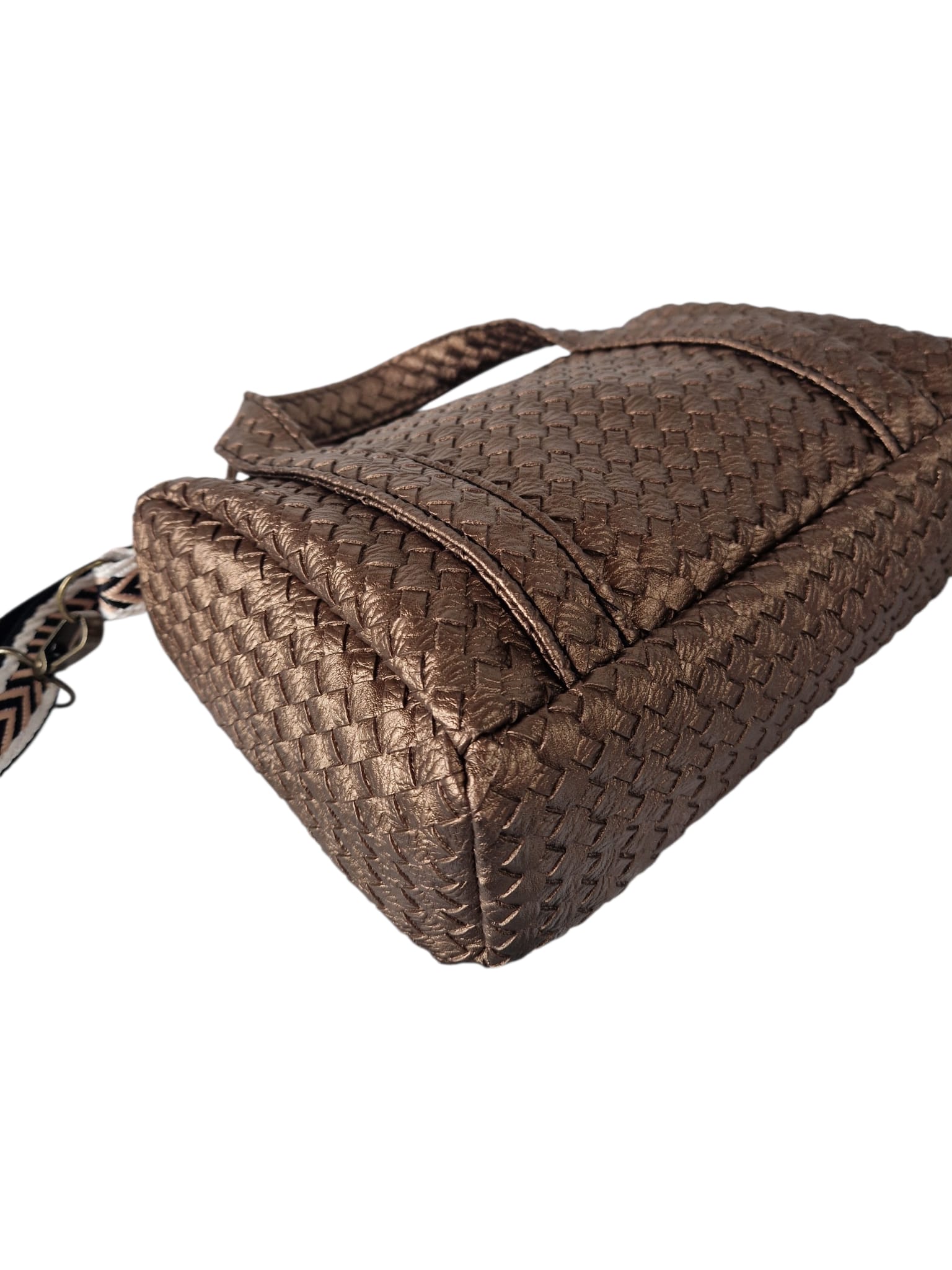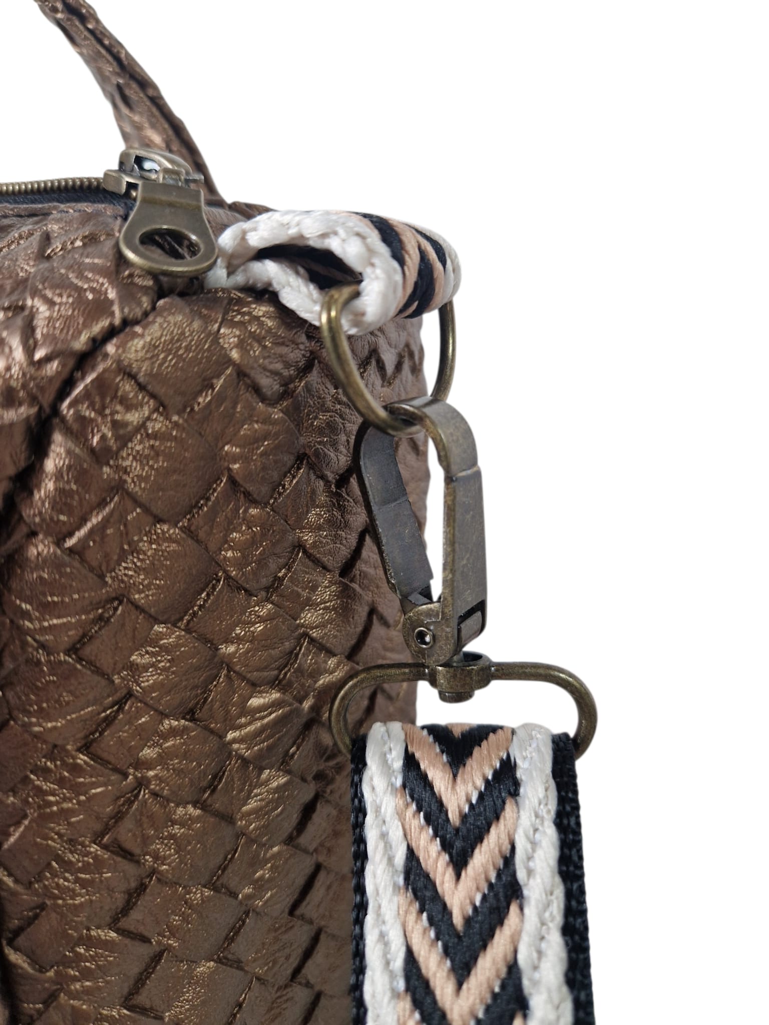 Material & Stil: Hochwertiges Upcycling-Material in edler Bronze-Metallic-Optik mit einer aufwendig geprägten Flechtstruktur.