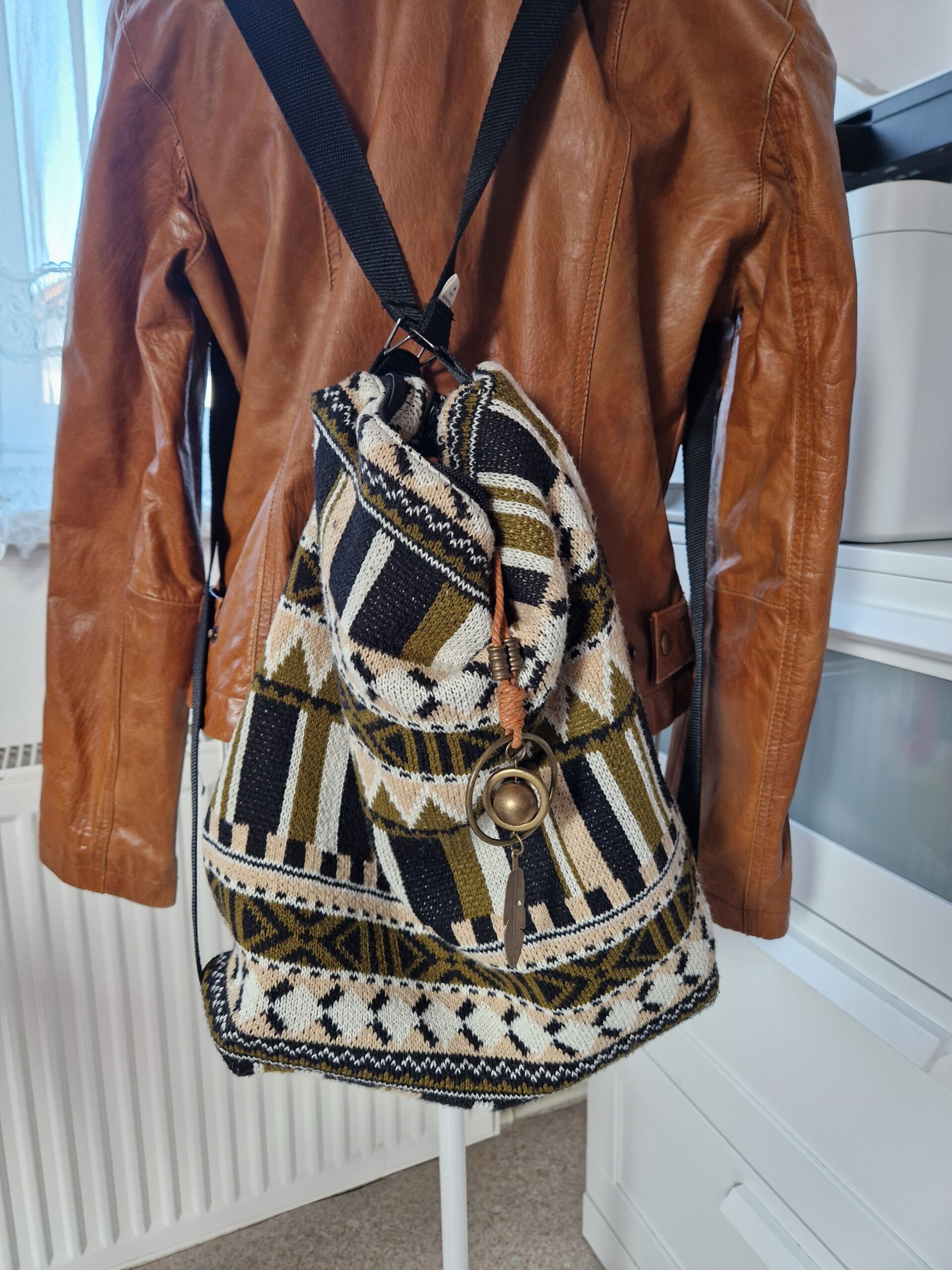 - Kombiniert mit markanten Stoffstreifen, die ein kunstvolles, helles Mandala-Muster (Boho-Stil) zeigen.