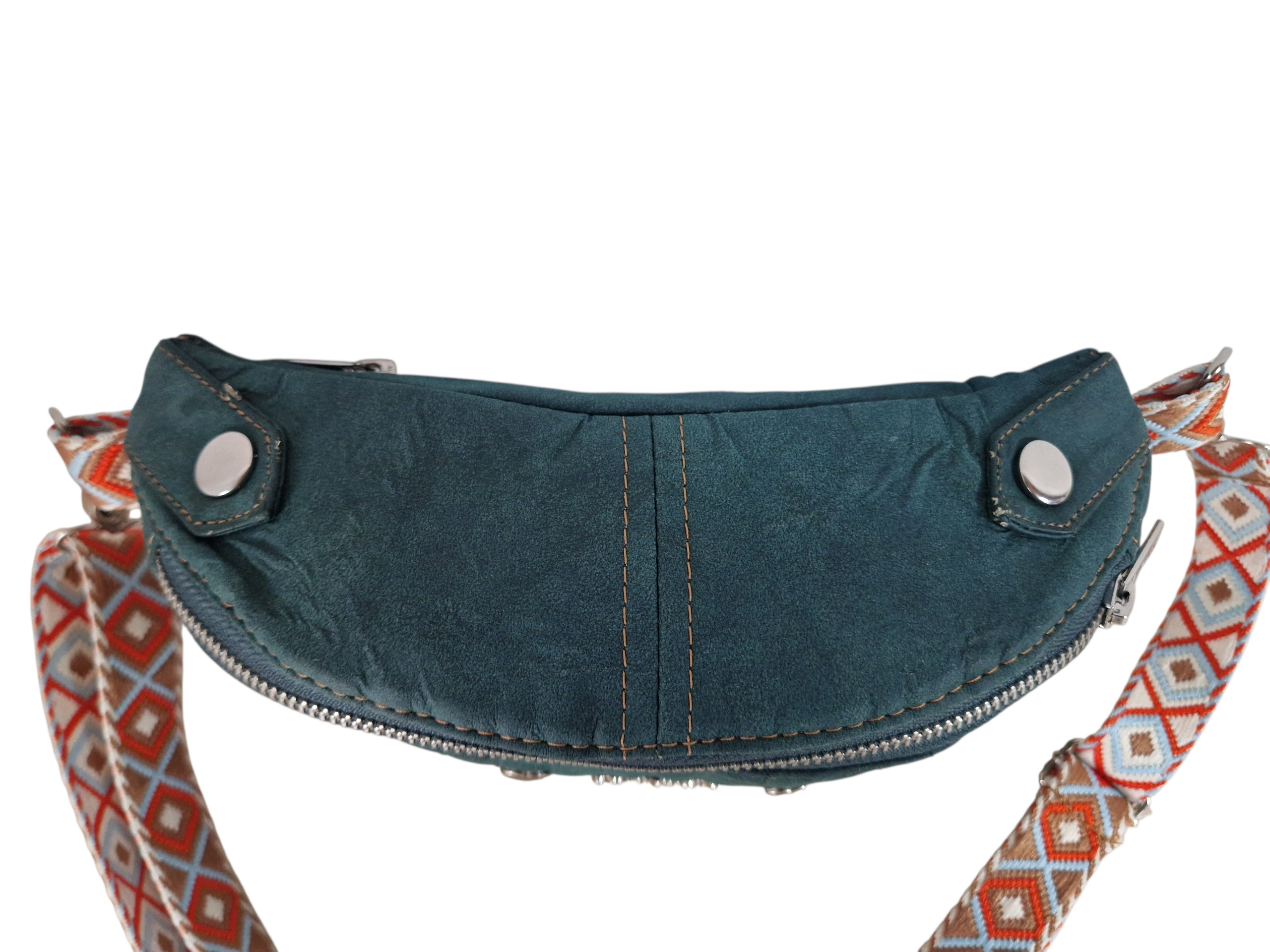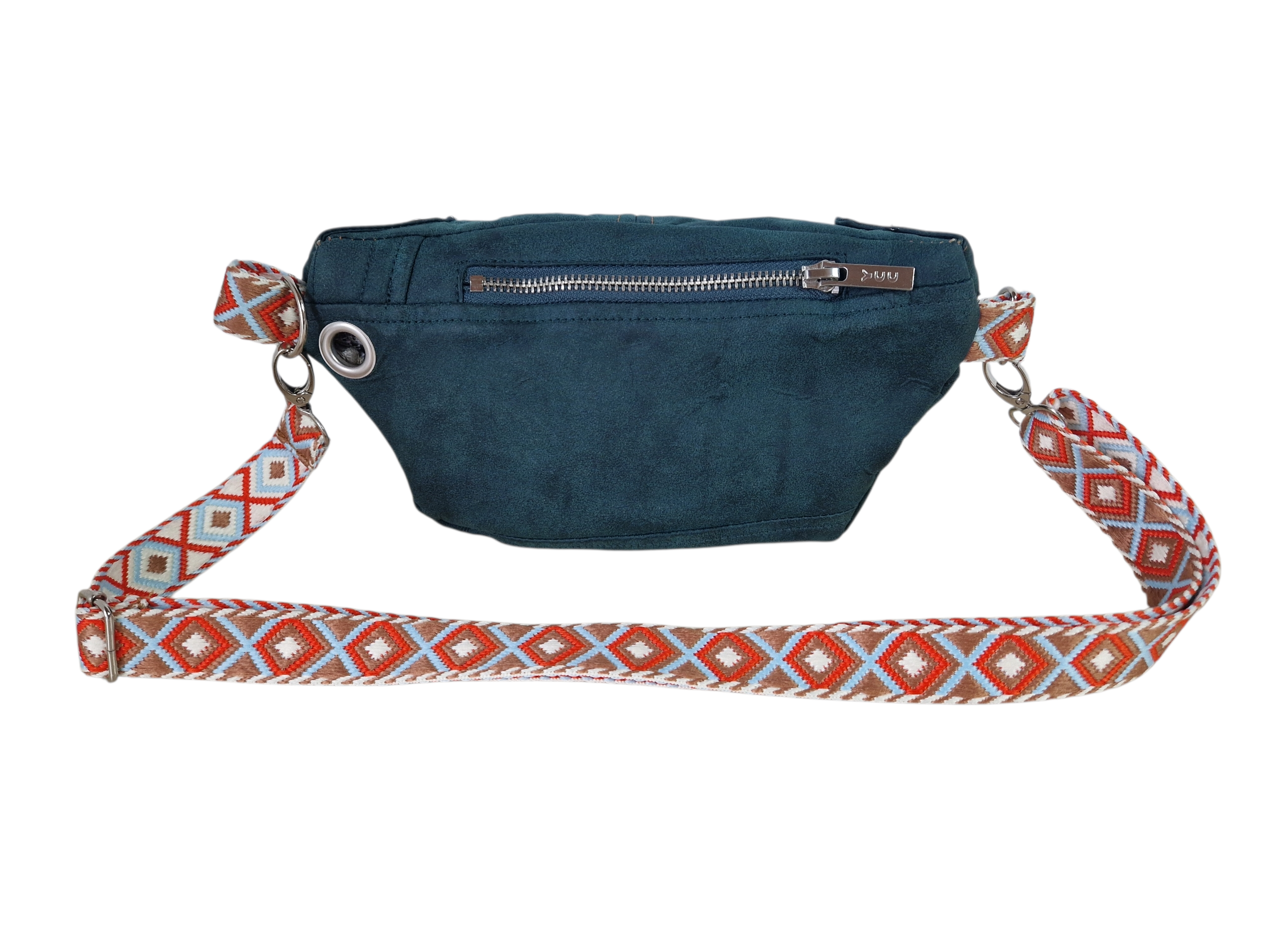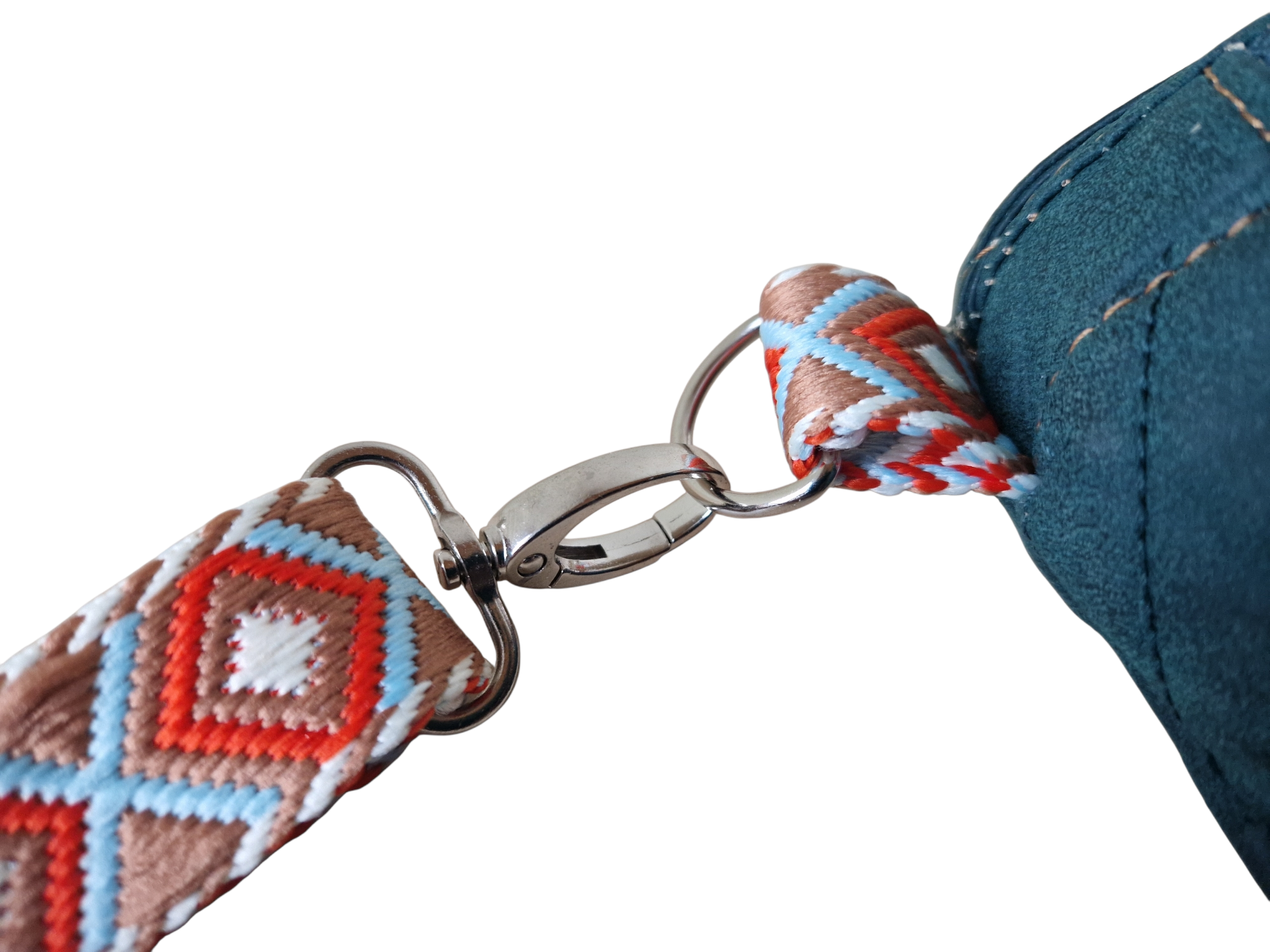 - Ethno-Chic: Der breite, gewebte Gurt im auffälligen Rautenmuster (Orange, Blau, Weiß) sorgt für einen spannenden Kontrast und garantiert maximalen Tragekomfort.