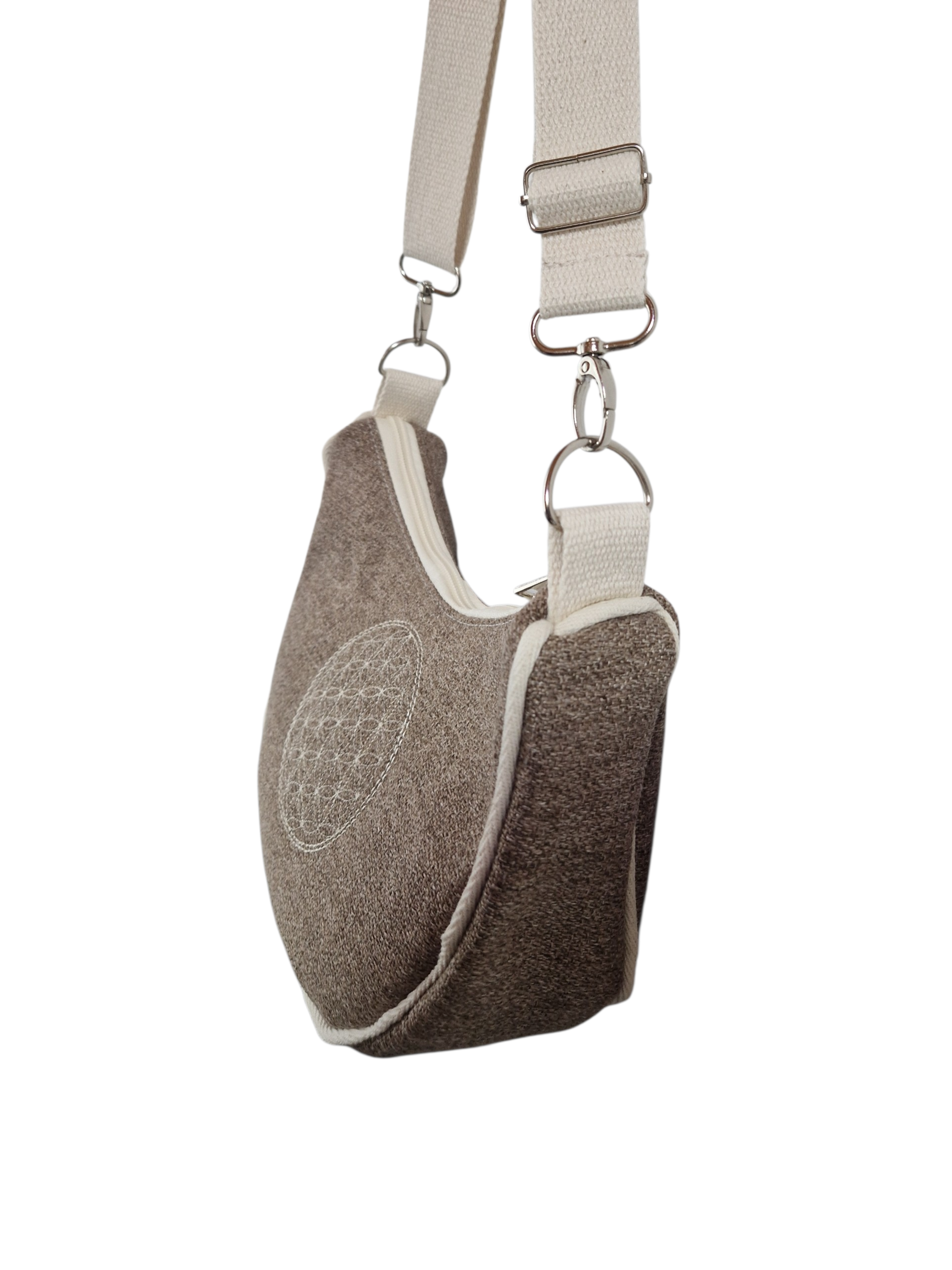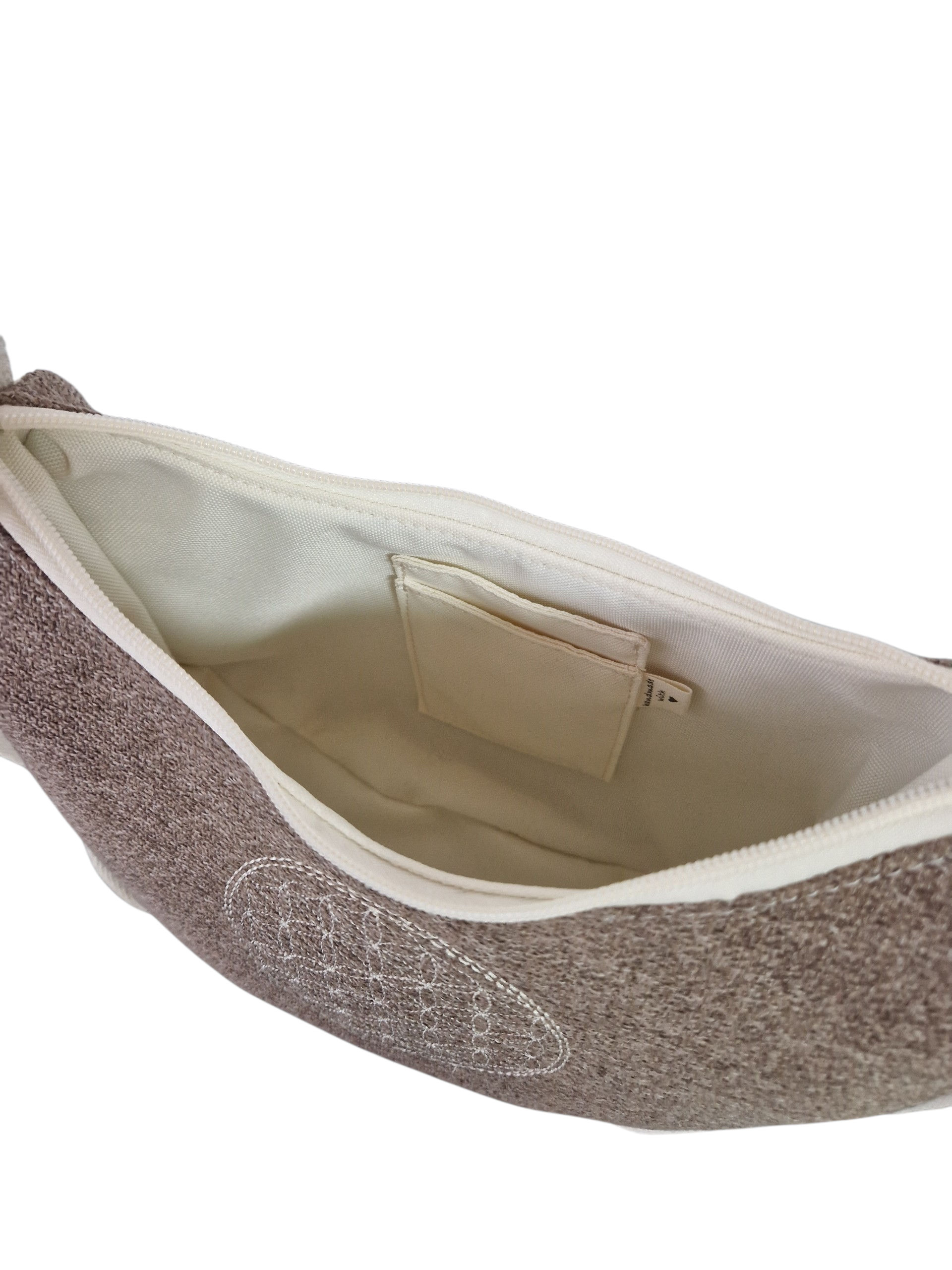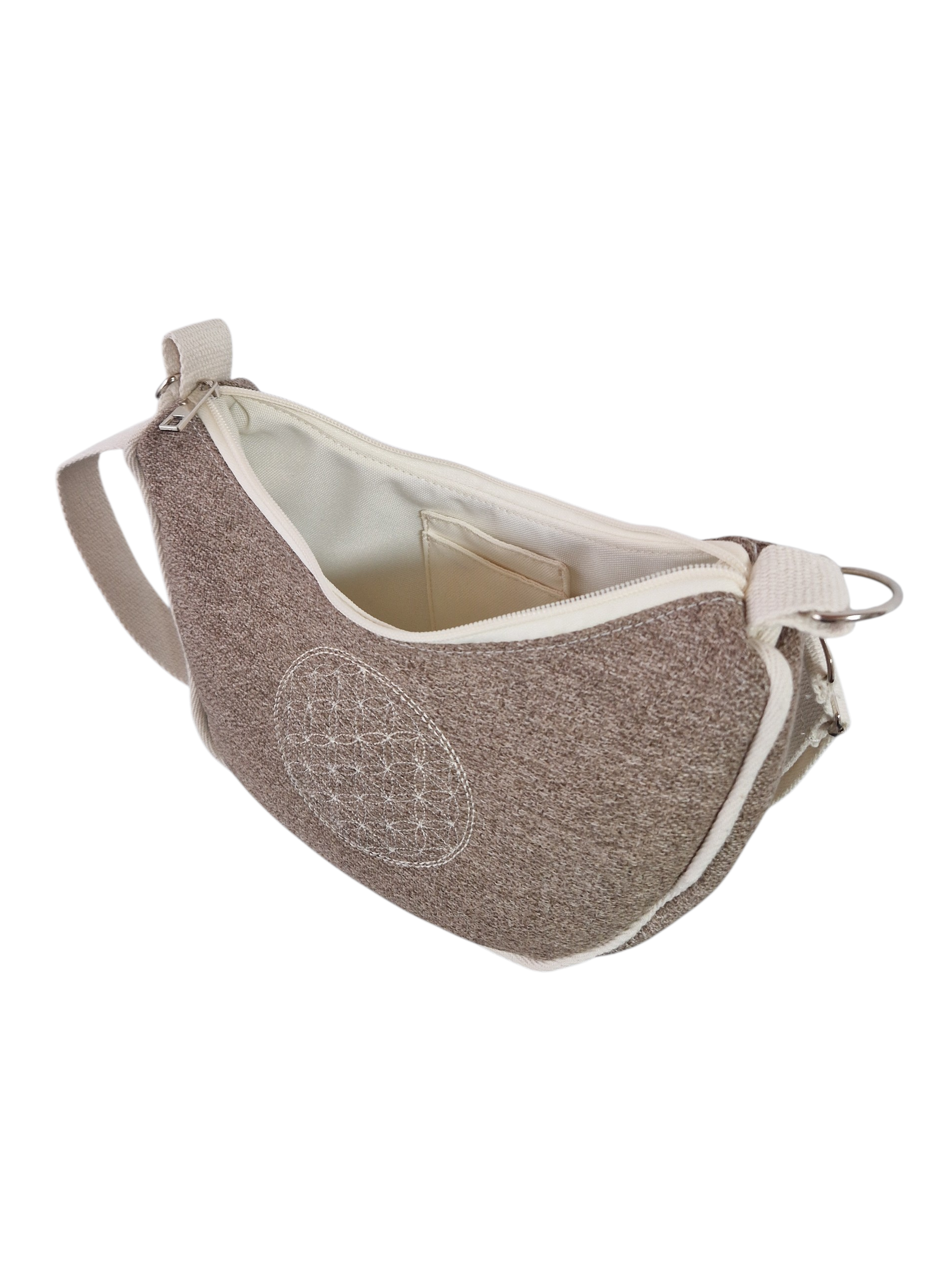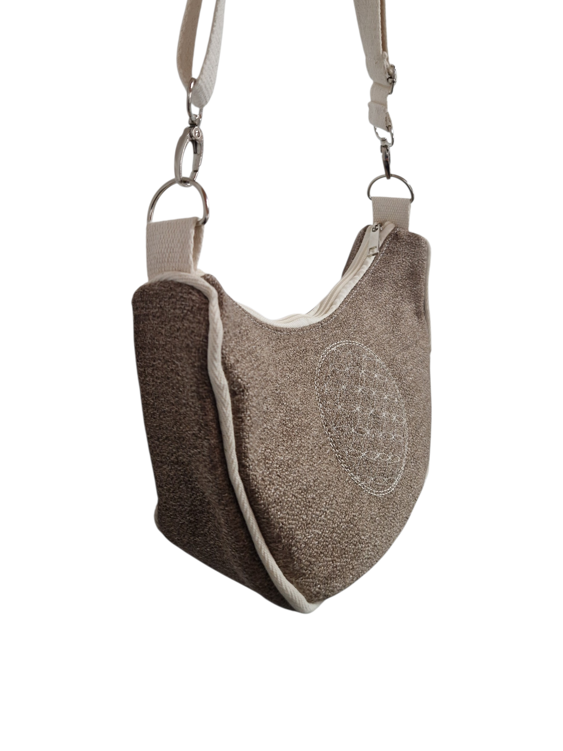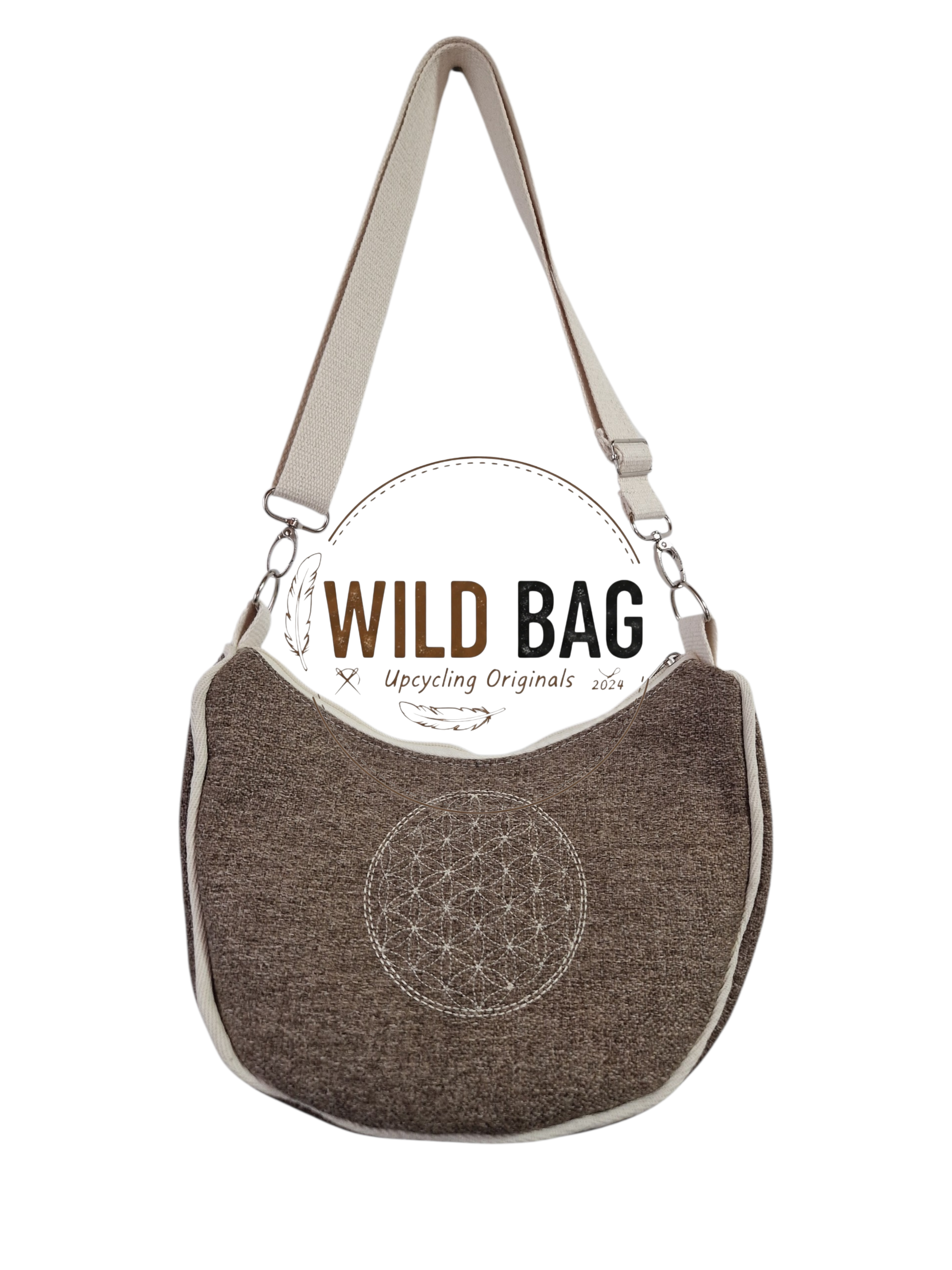 Spirituelles Detail: Die Vorderseite wird durch eine filigrane Bestickung der Blume des Lebens (Flower of Life) geziert – ein Symbol für Harmonie und kosmische Ordnung.