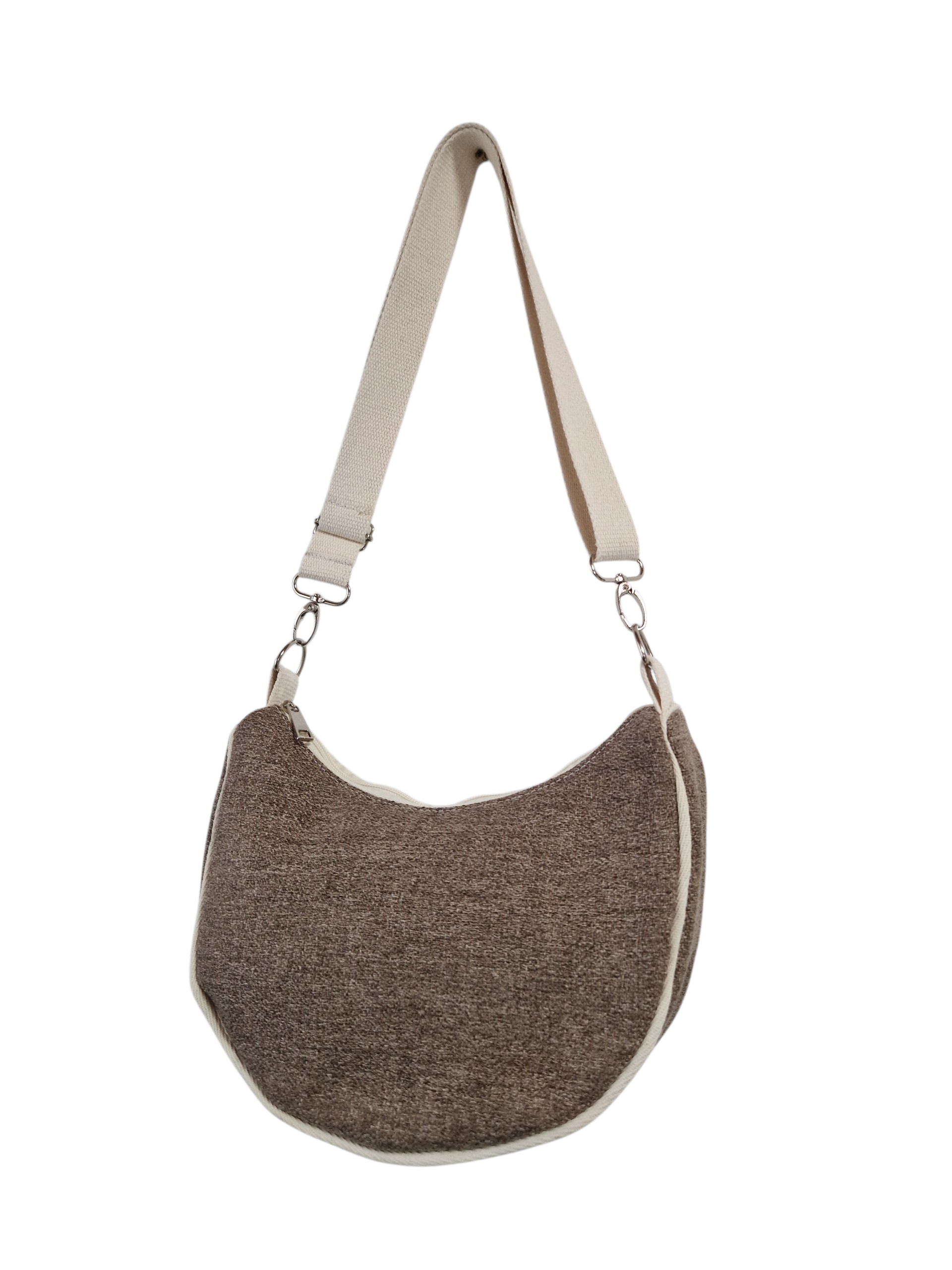 Einzigartige Optik: Die Tasche besticht durch ihren melierten Braunton in hochwertiger Textur, akzentuiert durch cremeweiße Paspeln, die der Form Struktur verleihen.