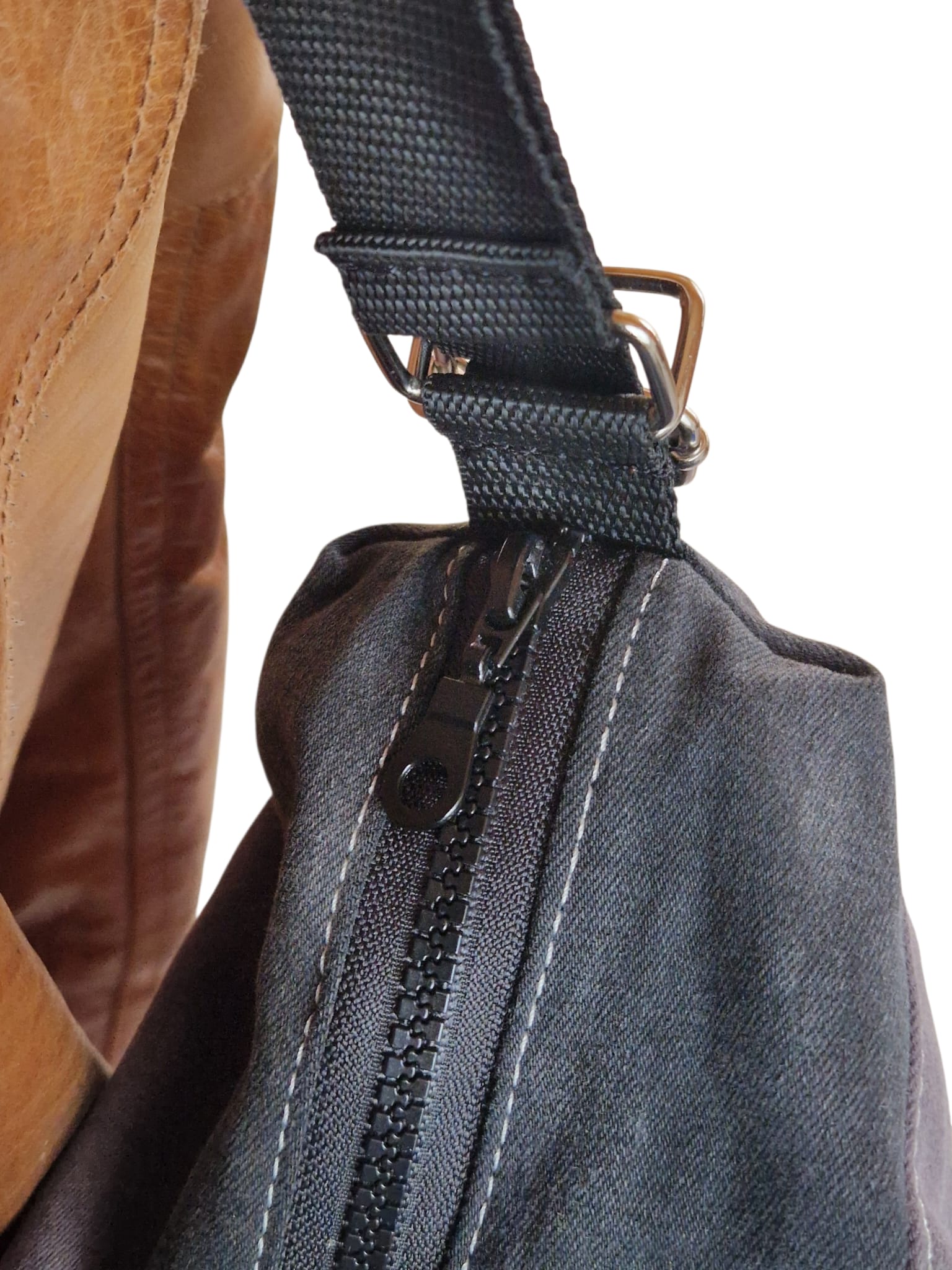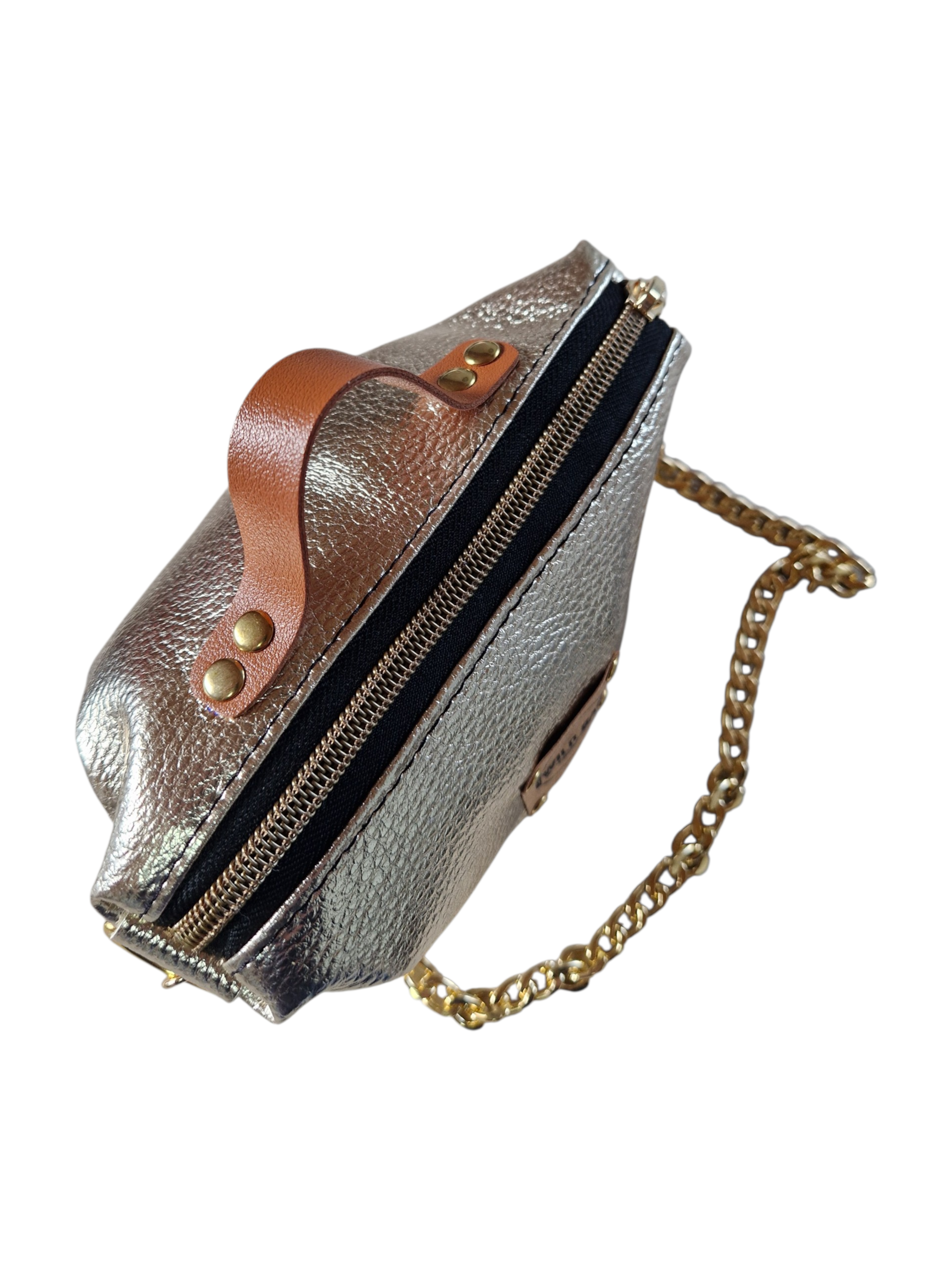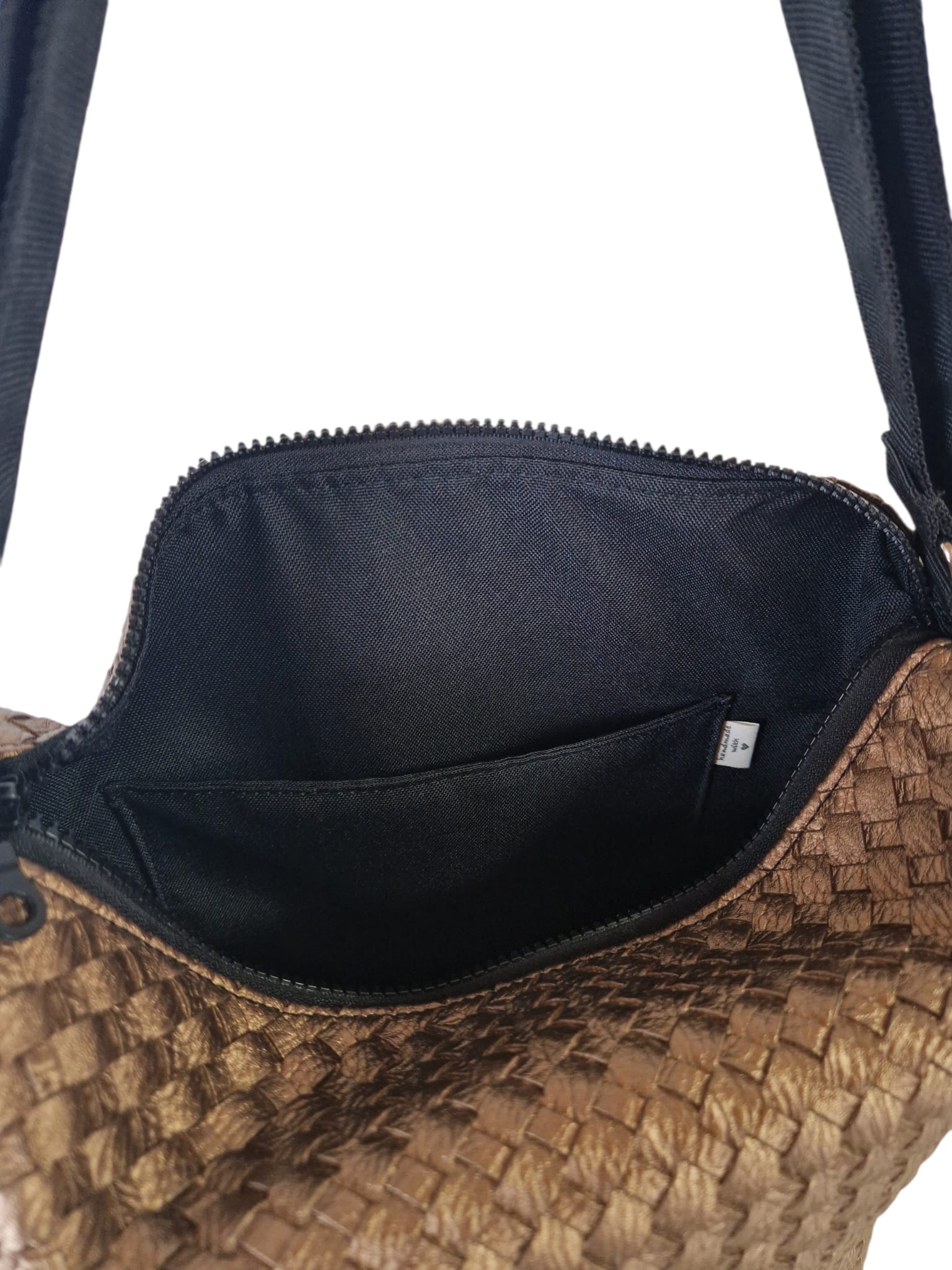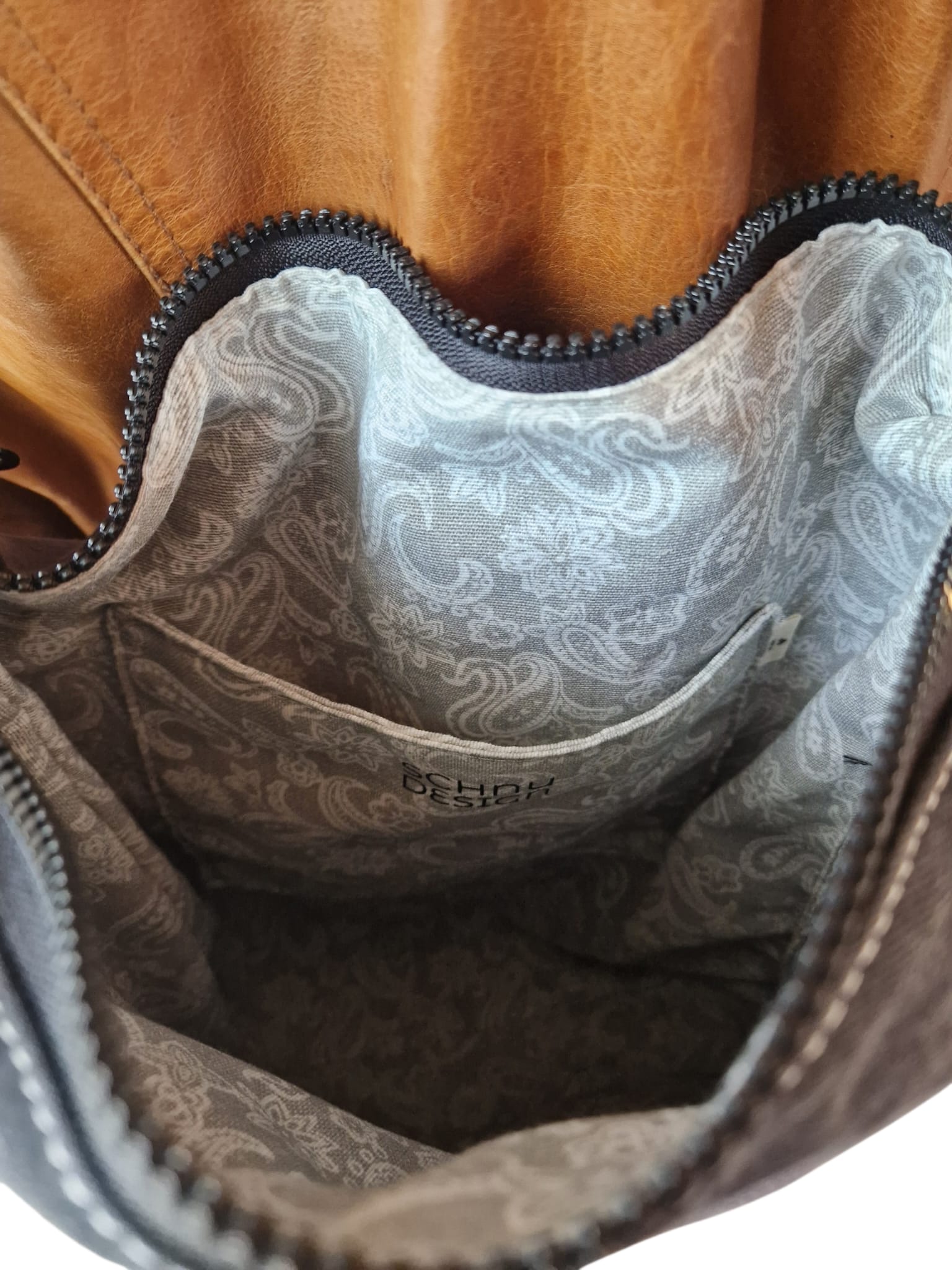 Farblicher Kontrast: Der kupferfarbene Reißverschluss harmoniert perfekt mit dem braunen Innenfutter und dem cognacfarbenen Tragegurt.