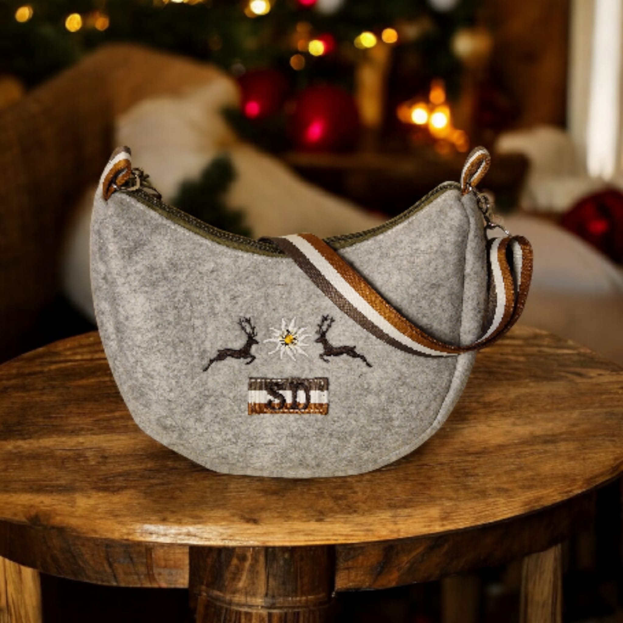 - Alpiner Look: Die Vorderseite besticht durch eine aufwendige Bestickung mit einem klassischen Edelweiß, das von zwei springenden Hirschen eingerahmt wird.