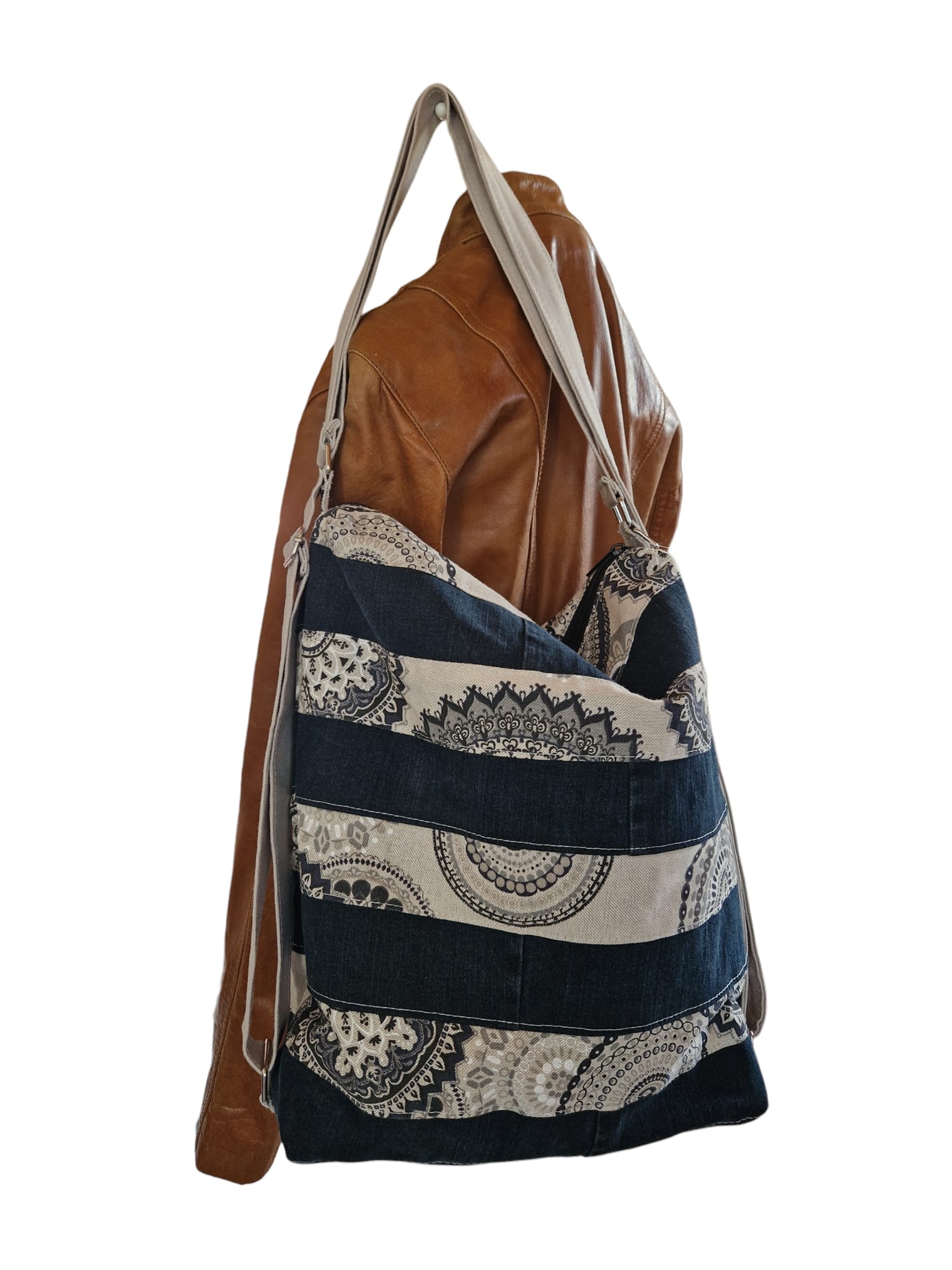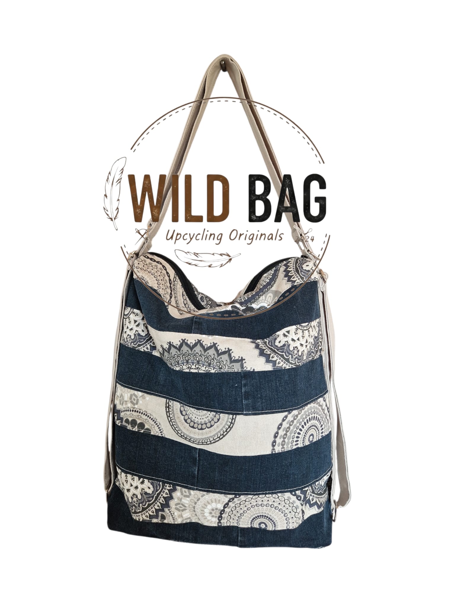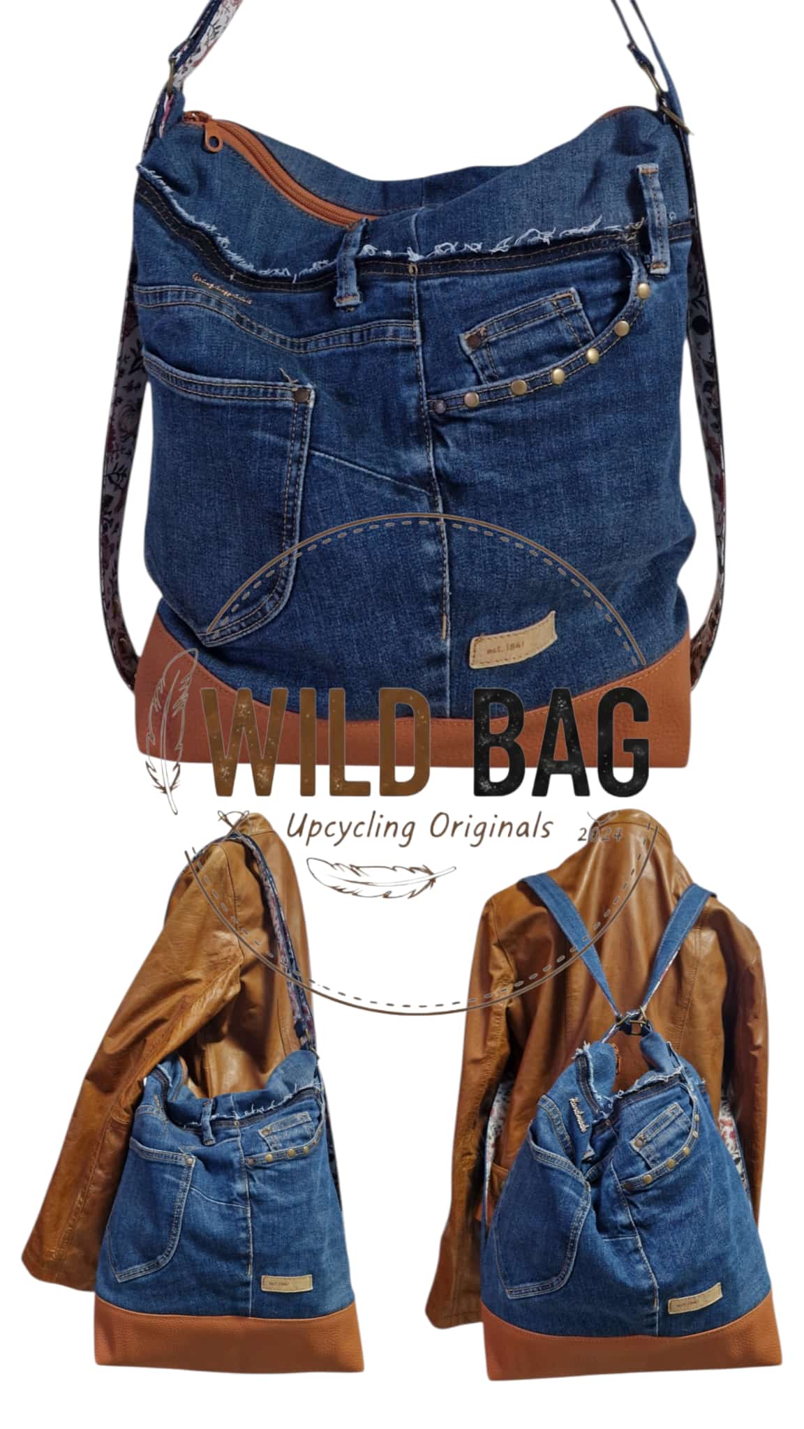 - Besonderheit: Jedes Modell ist ein handgefertigtes Unikat. Die Kombination aus robustem Jeansstoff und feinen Mustern verleiht der Tasche einen modernen, nachhaltigen Look.