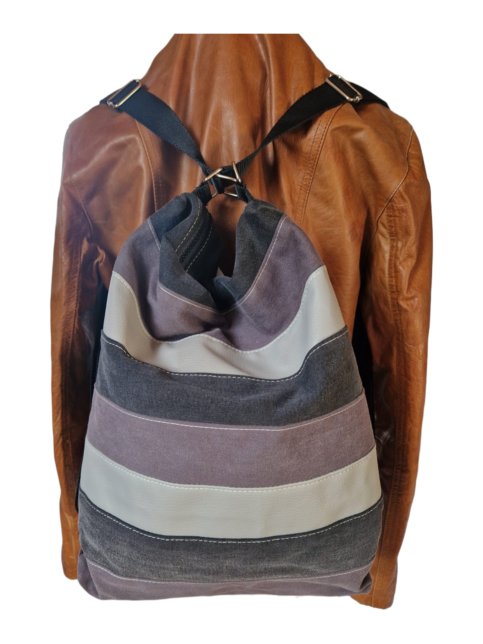 Material: Upcycling-Jeansstoff kombiniert mit hell- u. dunkelgrauen bis schwarzen Streifen.