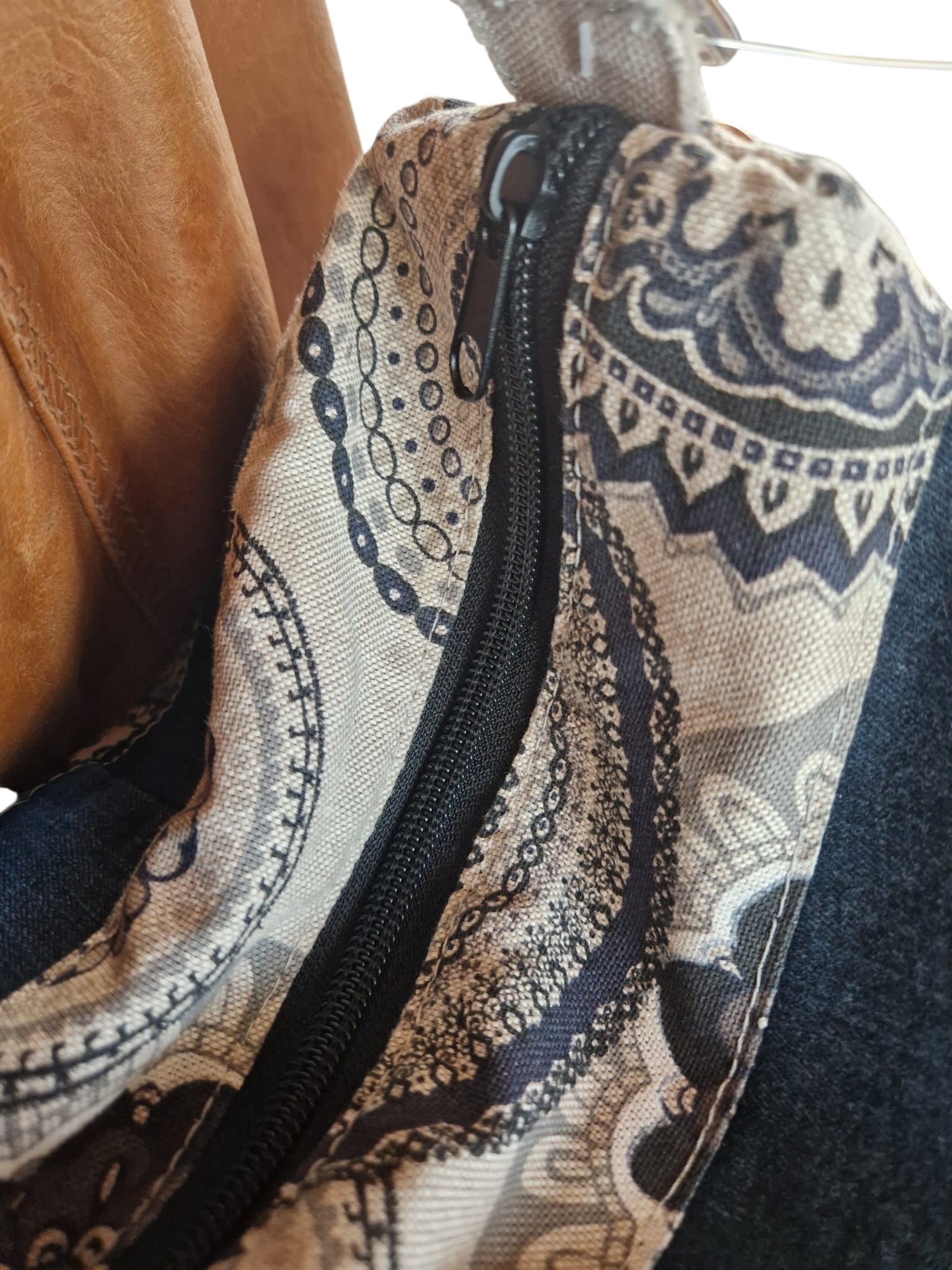 Innenfutter: Hochwertiger heller Stoff mit dekorativem Mandala-Print in Braun- und Schwarztönen.