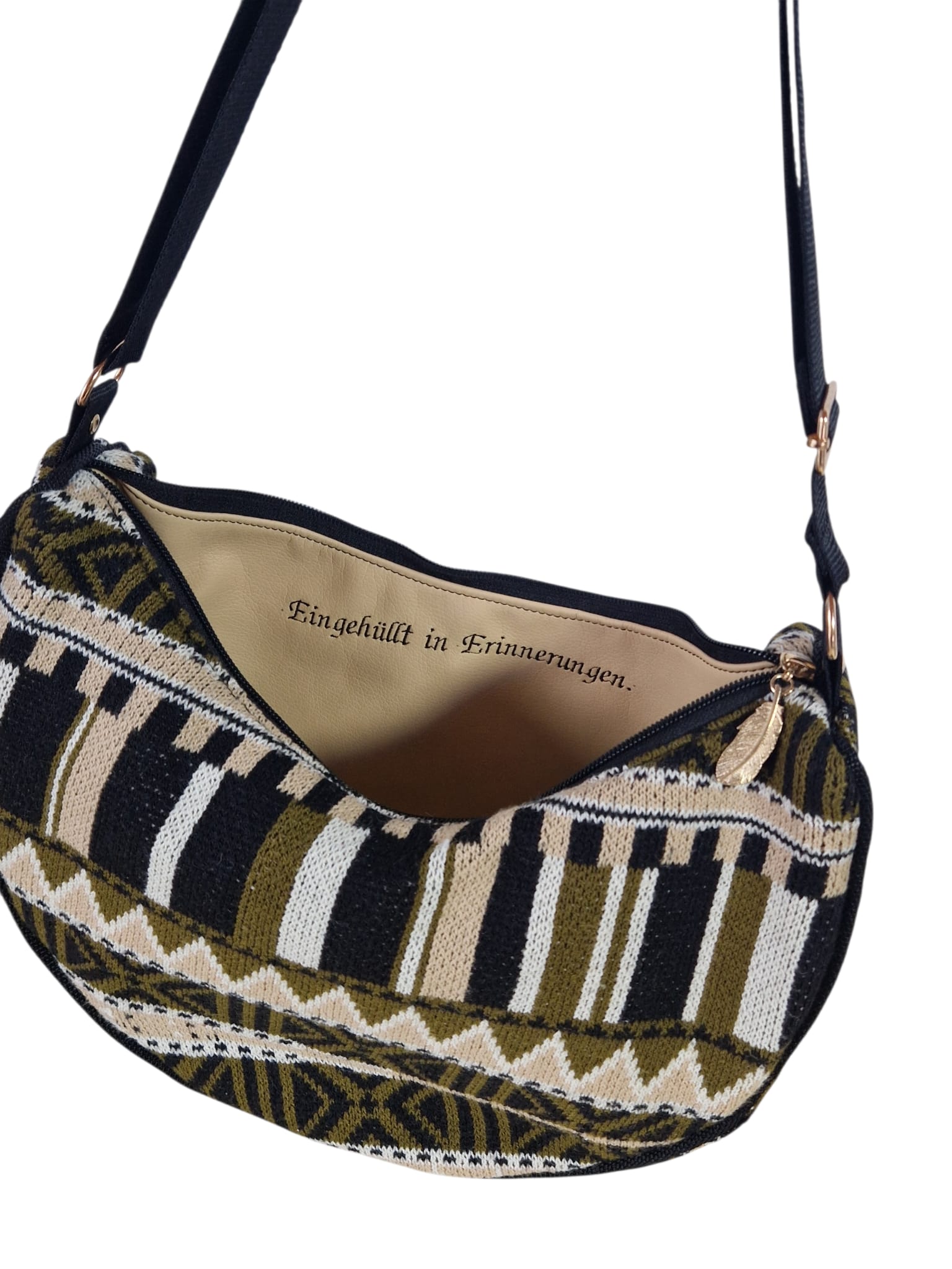 Herzensbotschaft: Das Highlight verbirgt sich im Inneren. Der sanfte Schriftzug „Eingehüllt in Erinnerungen“ auf dem hellen, weichen Kunstleder macht diese Tasche zu einem ganz persönlichen Begleiter oder einem tiefgründigen Geschenk.