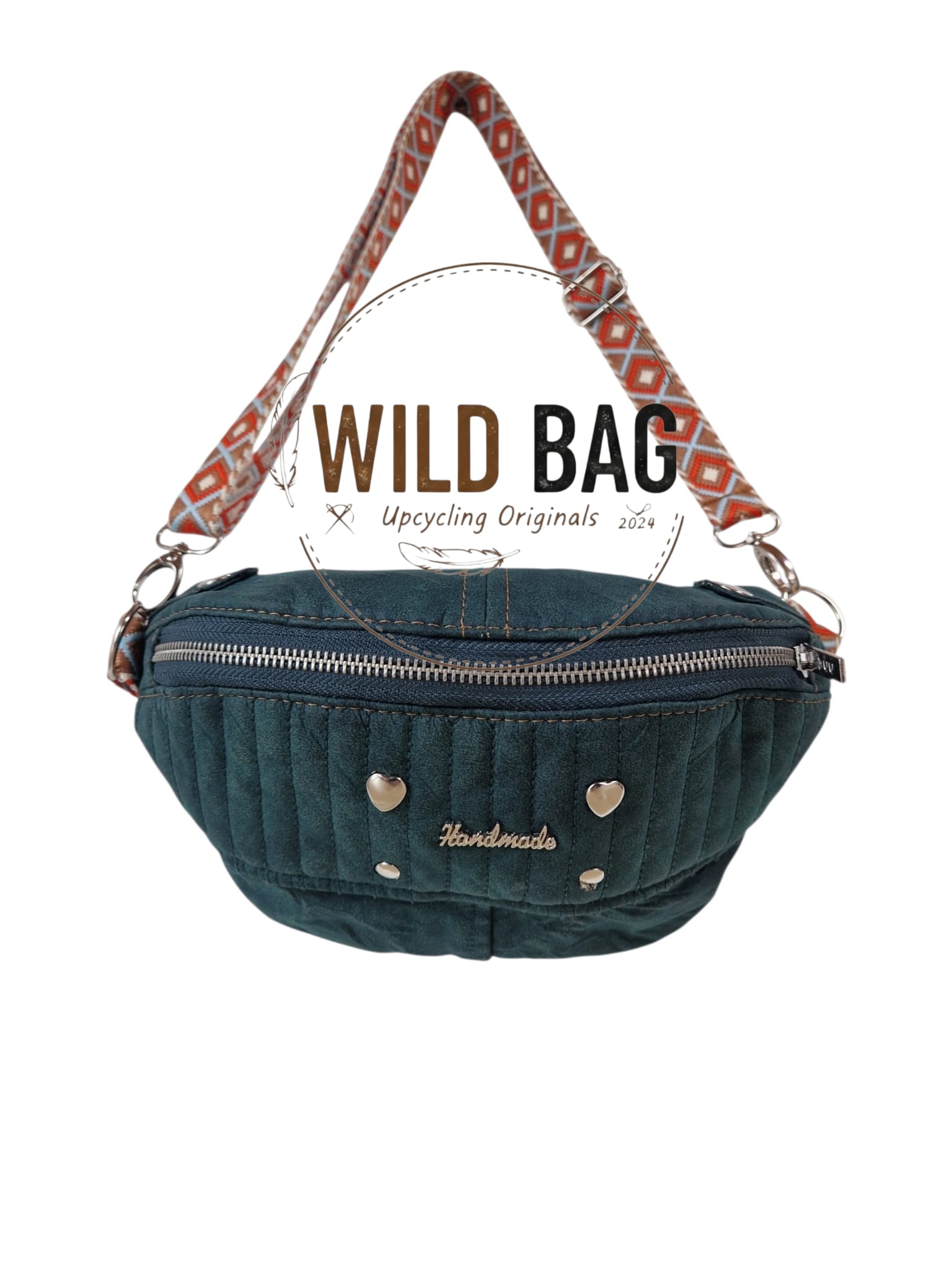 - Liebevolle Details: Kleine, silberfarbene Herz-Nieten und ein filigraner „Handmade“-Schriftzug setzen verspielte Akzente auf dem satten Petrol.