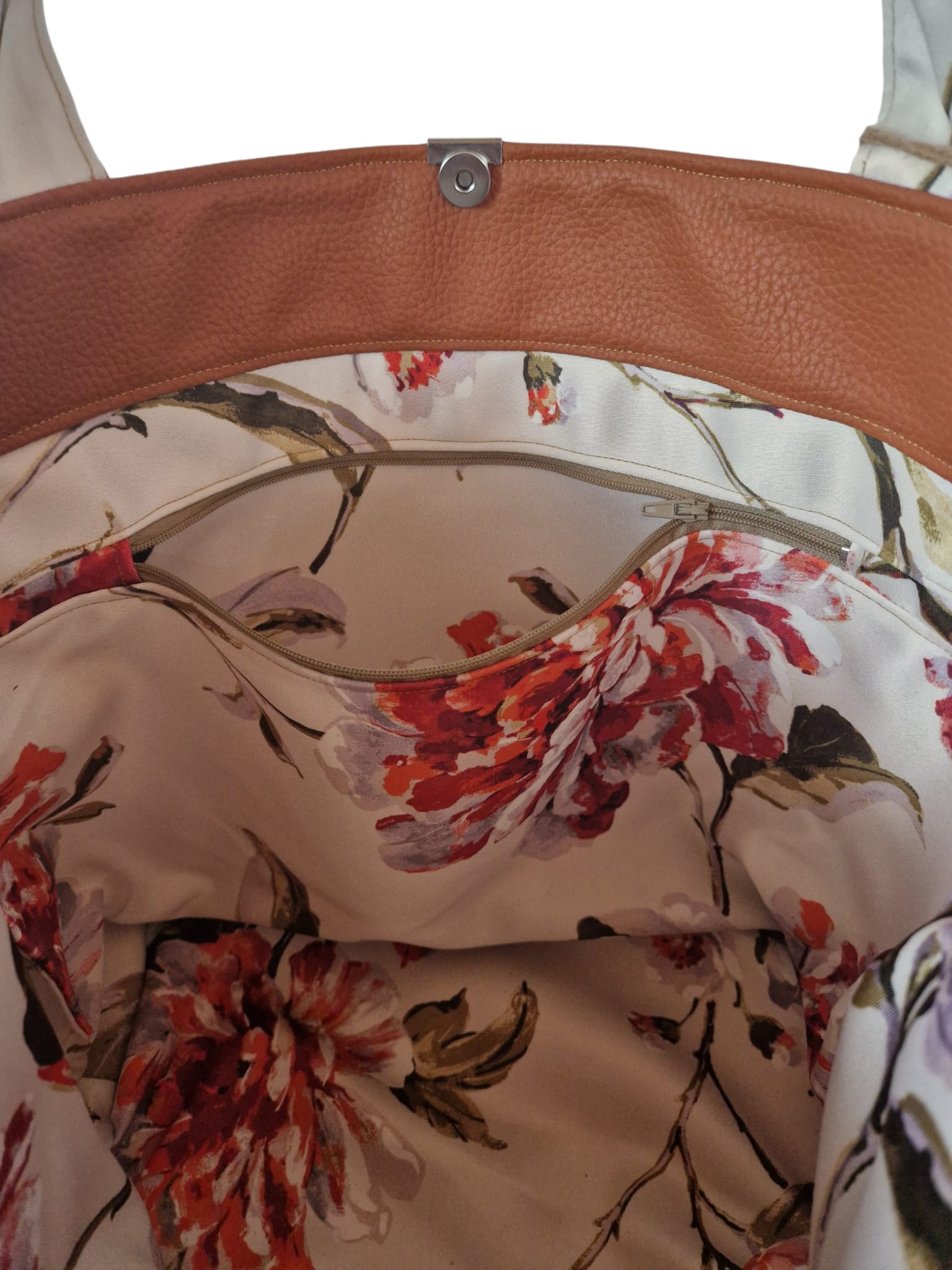 Innenleben: Das florale Muster setzt sich im Inneren fort. Ein integriertes Reißverschlussfach sorgt dafür, dass Schlüssel, Smartphone oder Geldbeutel immer sicher und griffbereit verstaut sind.